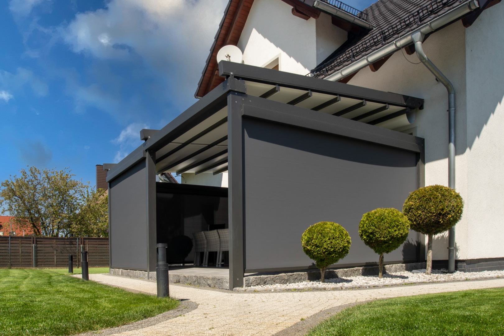 En pergola med foldetak har et motorisert tak som kan åpnes og lukkes etter behov. Den gir fleksibel beskyttelse mot sol, regn og vind.